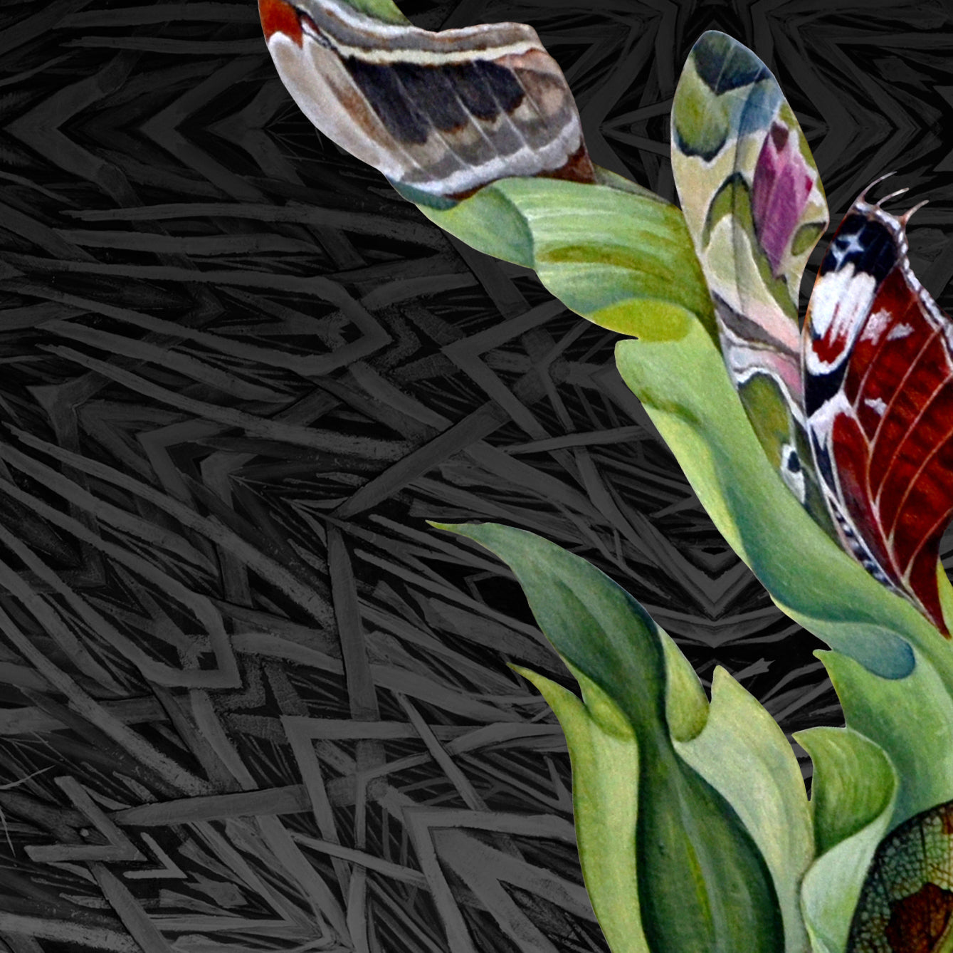 Several years back I became involved in the business of Aquaponics. Our company built a greenhouse to grow food sustainably using fish waist as fertilizer. The system is on a loop that connects deep water plant beds with the fishtanks. It is almost miraculous how quickly the plants spring up! They are lush and delicious. I wanted to find a way to contribute to this beautiful facility we built and I ended up painting a mural. The piece had my characteristically surreal touch to it and a very rich color palette. I decided to paint a suspended tree with a root ball. A pair of Koi presented in a yin and yang composition and were the life force of the tree; a representation of what we were doing. We ended up using the image on some of the company swag. I've taken parts of both Koi to create this textile layering onto the dark nesting textile.