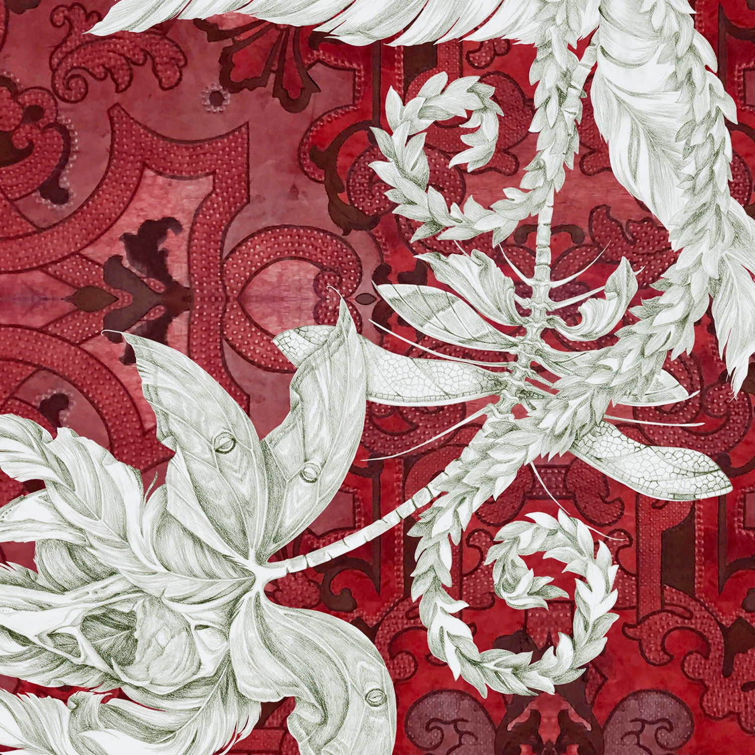 A few years after I did the Draw Me show I was invited to participate in an all women's group show in LA. I was still really enamored with the idea of continuing my graphite works on paper. I had done a piece called "The Artist at Middle Life" that had been included in a juried show here in Colorado and decided to create the companion piece, "Robin's Flower." They were shown together. The flower is top heavy, like a peony, and nestles a badger skull in its center. Not too long before I made it, my girlfriend Jools presented me with a box of bones that included the skull. Someone I had never met, but was familiar with my work, had given it to her to pass along. The drawing is a funereal flower for my friend Robin Rule who we lost at that time. I wanted to create something, both dark and lovely, worthy of the place she will always hold for me. I have recently started removing the backgrounds on some of my drawings so as to be able to layer them on a contrasting background giving them a crisp presence. In this textile, Robin's Flower is combined with Izzy in a new color I recently developed.